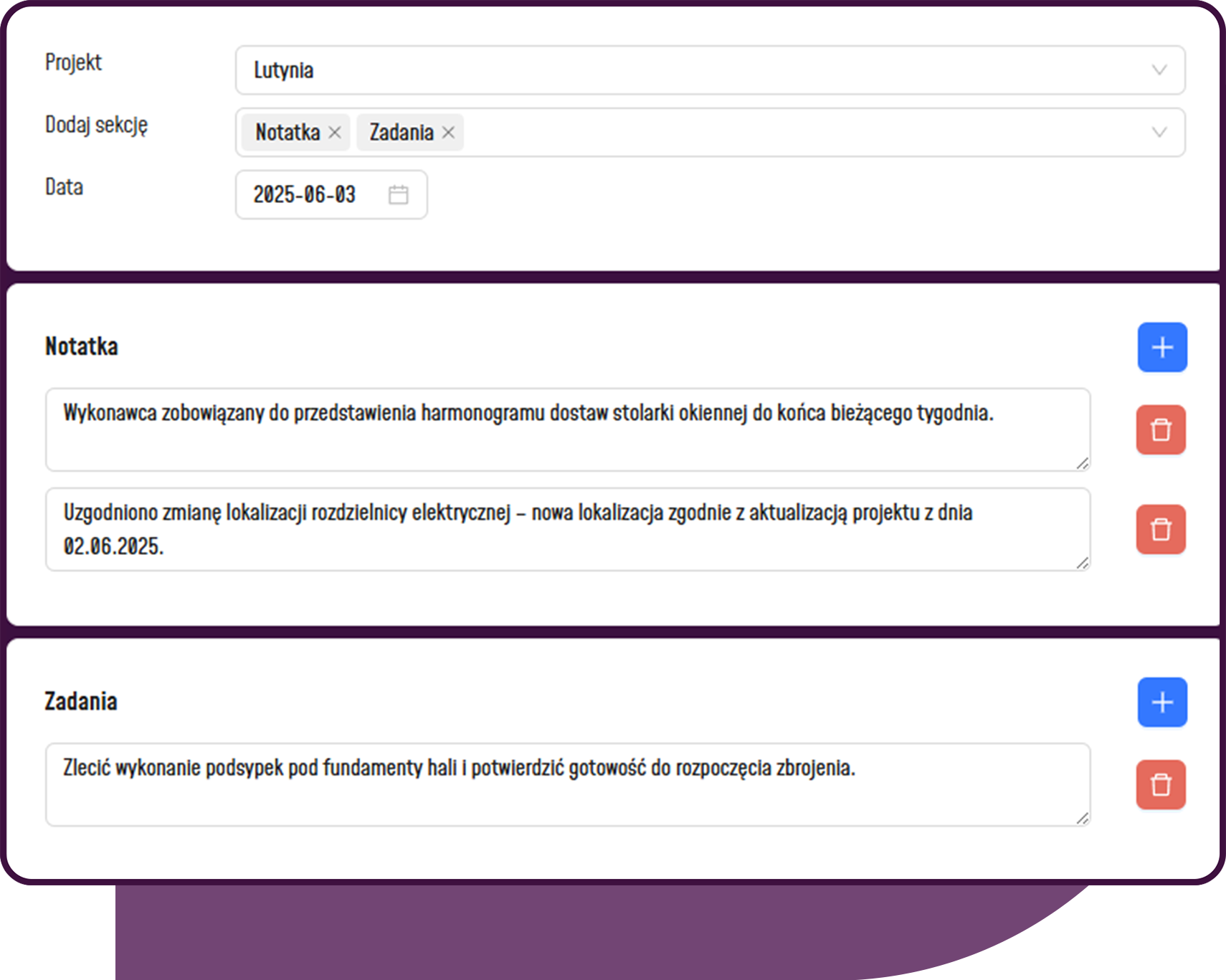 Jednym kliknięciem jesteśmy w stanie wygenerować potrzebny dokument na budowie – protokół odbioru, pismo organizacyjne lub wniosek materiałowy.